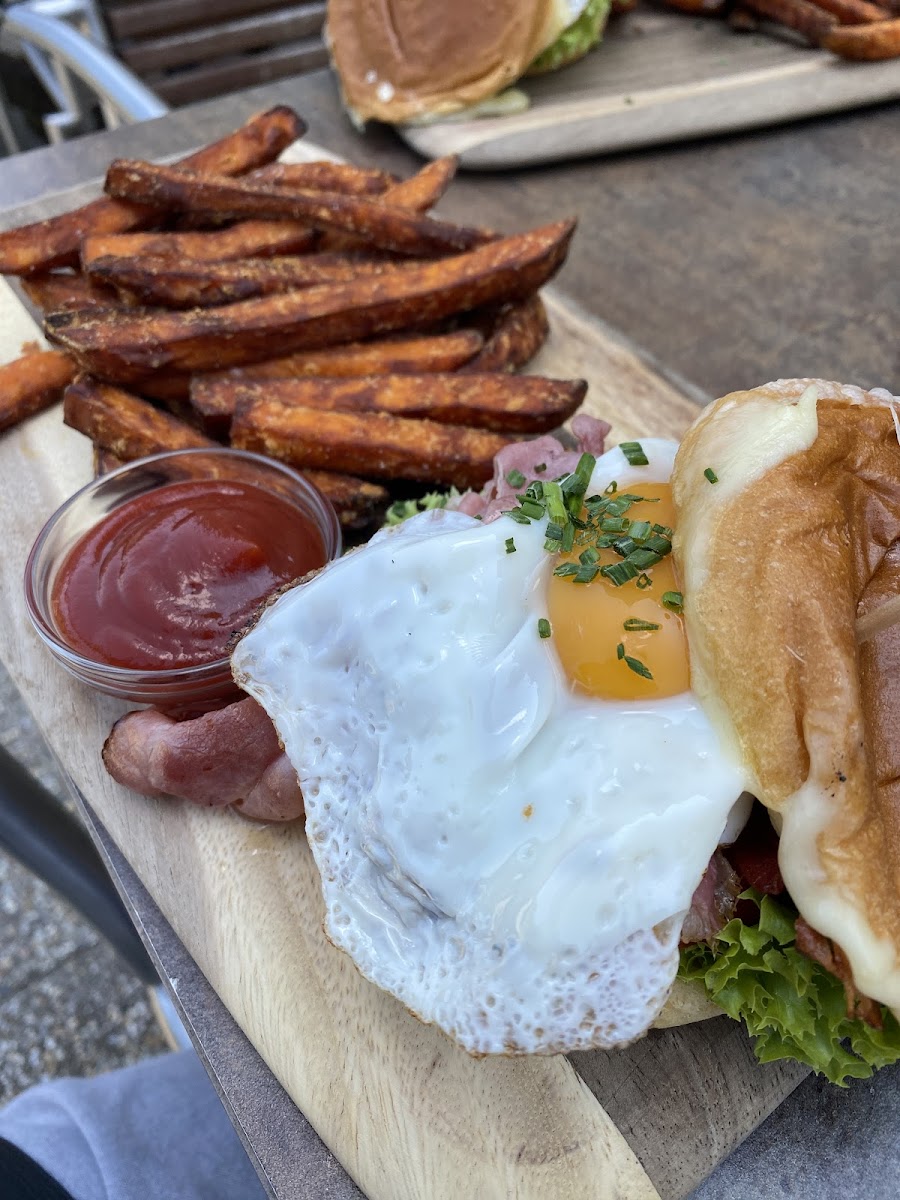 Amazing cappuccino and breakfast! Highly recommend. My husband got the breakfast burger and I got the ham and eggs. Very good!!!! Fast service too.